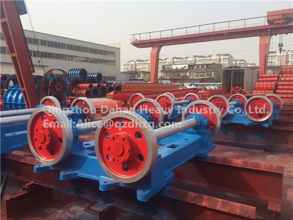 The centrifugal machine is mainly used to manufacture the centrifugal equipments manufacturing the reinforced concrete drainpipes, driving the spinning of the drainpipe concrete pipe mold loaded with some concrete and reinforcing steel with a certain mixing ratio at different speeds, and  the solid phase particles of concrete in steel mould will be centrifugal settling in the steel mould inner surface under centrifuge, meanwhile draining the excessive water, thus forming compacting concrete structure namely reinforcing concrete drainpipe. The machine mainly consists of riding wheels, shafts, bearing block, bearing, V-blet pulley, base and electromagnetic speed-controlling motor.